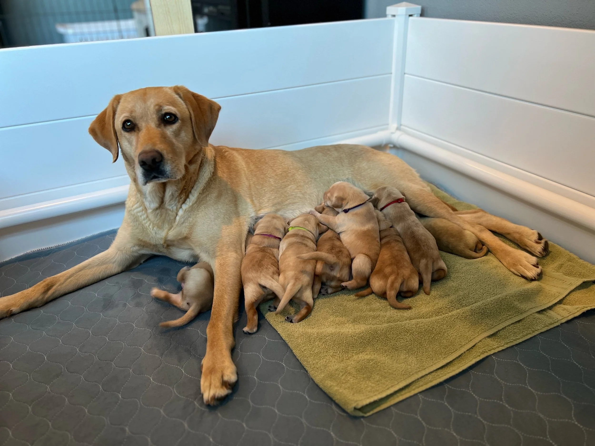 Can’t believe we’re already a 1/4th of the way there! Eyes are opening! Eva celebrated her second Mother’s Day! Little babies are 3 pounds now except for the little guy who is now over 2 pounds, hallelujah!! They’re starting to walk and get very vocal especially when they’re hungry! Life is good when you’re living in puppy heaven!
